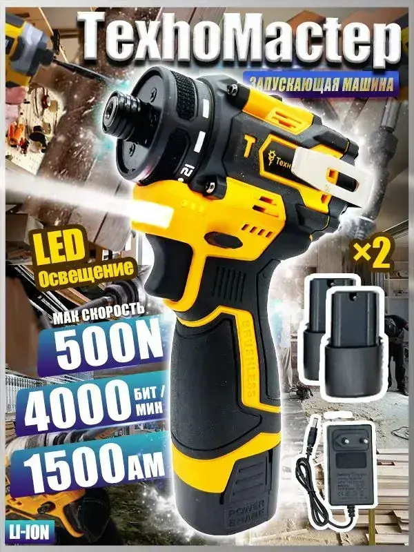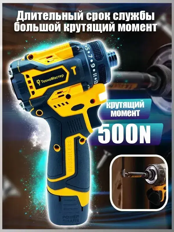ТехноМастер TooLs Электрический ударный шуруповерт с бесщеточной головкой, может быть оснащен патроном, литиевая батарея x2, 18 В