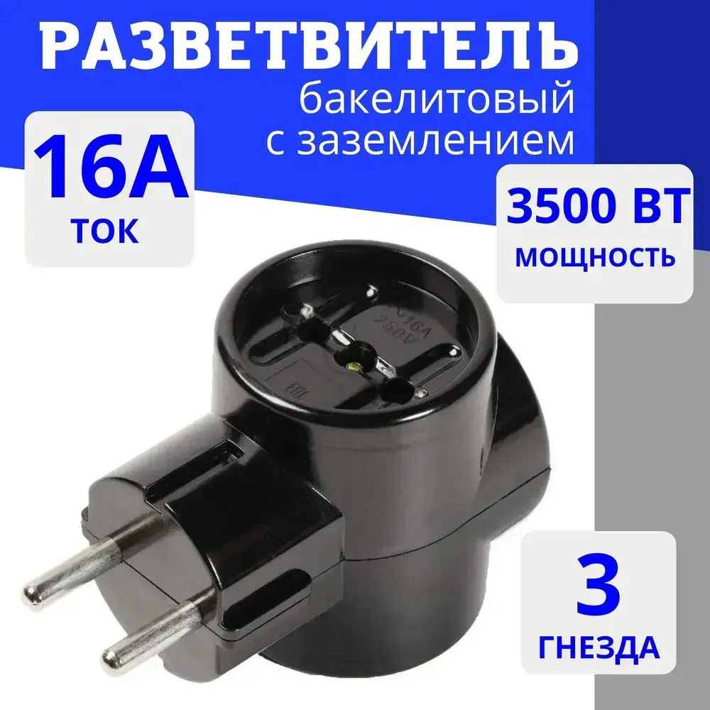 Тройник для розетки 3 гнезда бакелитовый 16А 250B, черный