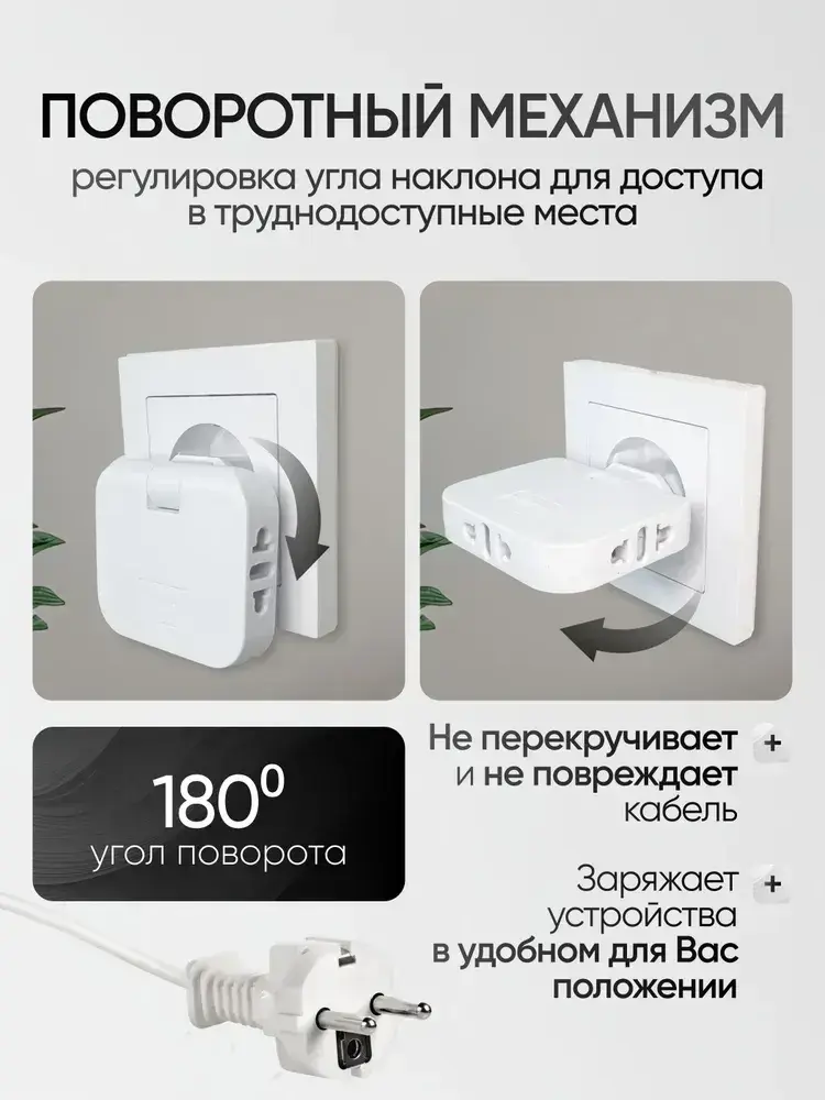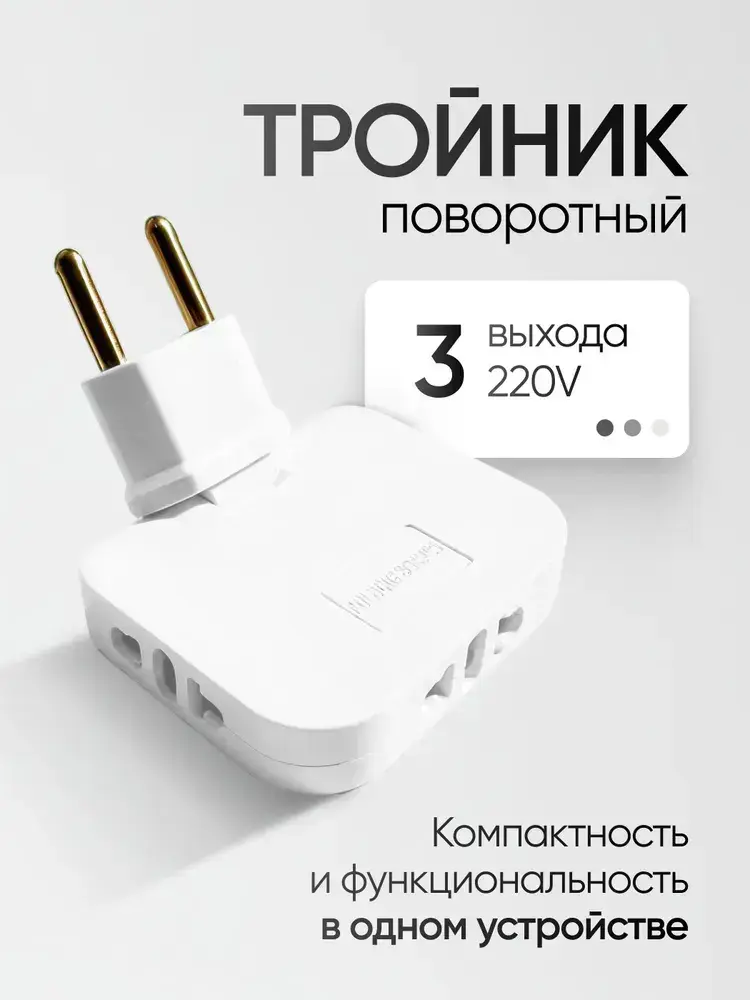 Тройник для розетки плоский поворотный на 180 градусов, разветвитель электрический