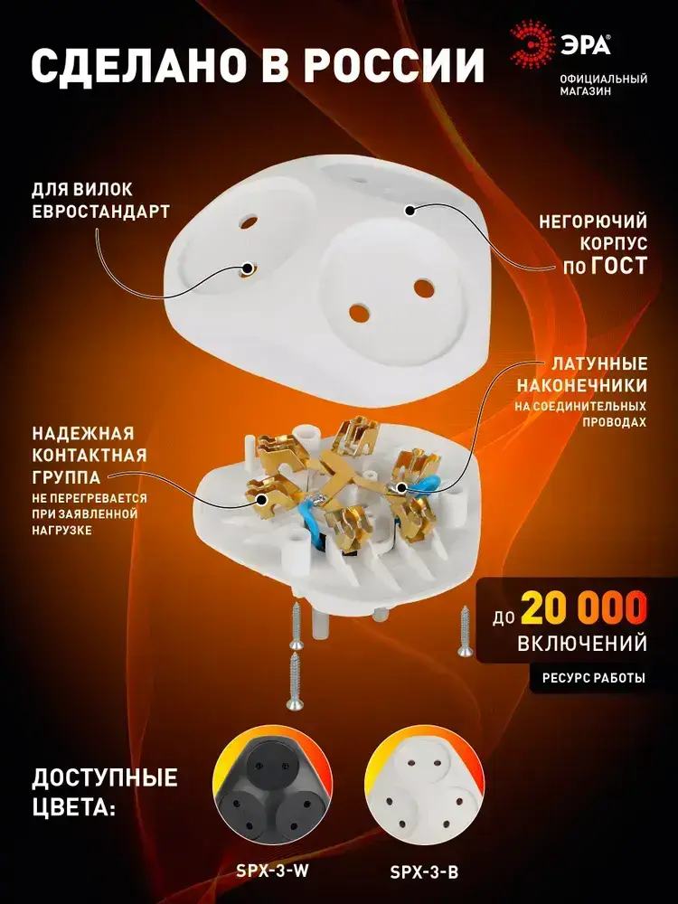 Тройник розетка электрический плоский SPx-3-W ЭРА / Разветвитель электрический без заземления, 3 розетки, 10А, белый