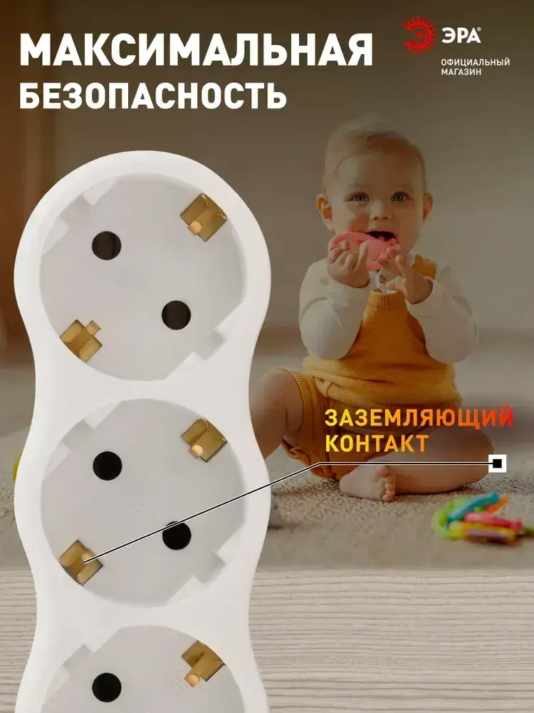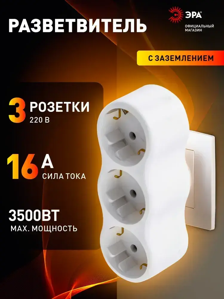 Тройник розетка электрический SPx-3e-W ЭРА / Разветвитель электрический с заземлением, 3 розетки, 16А, белый