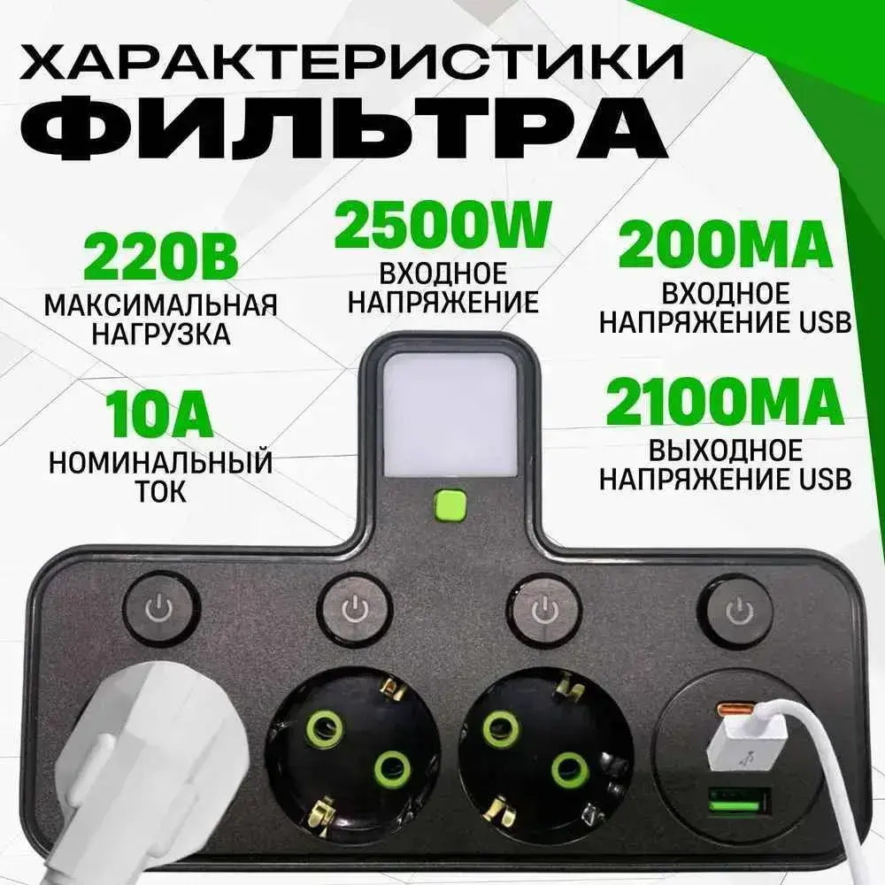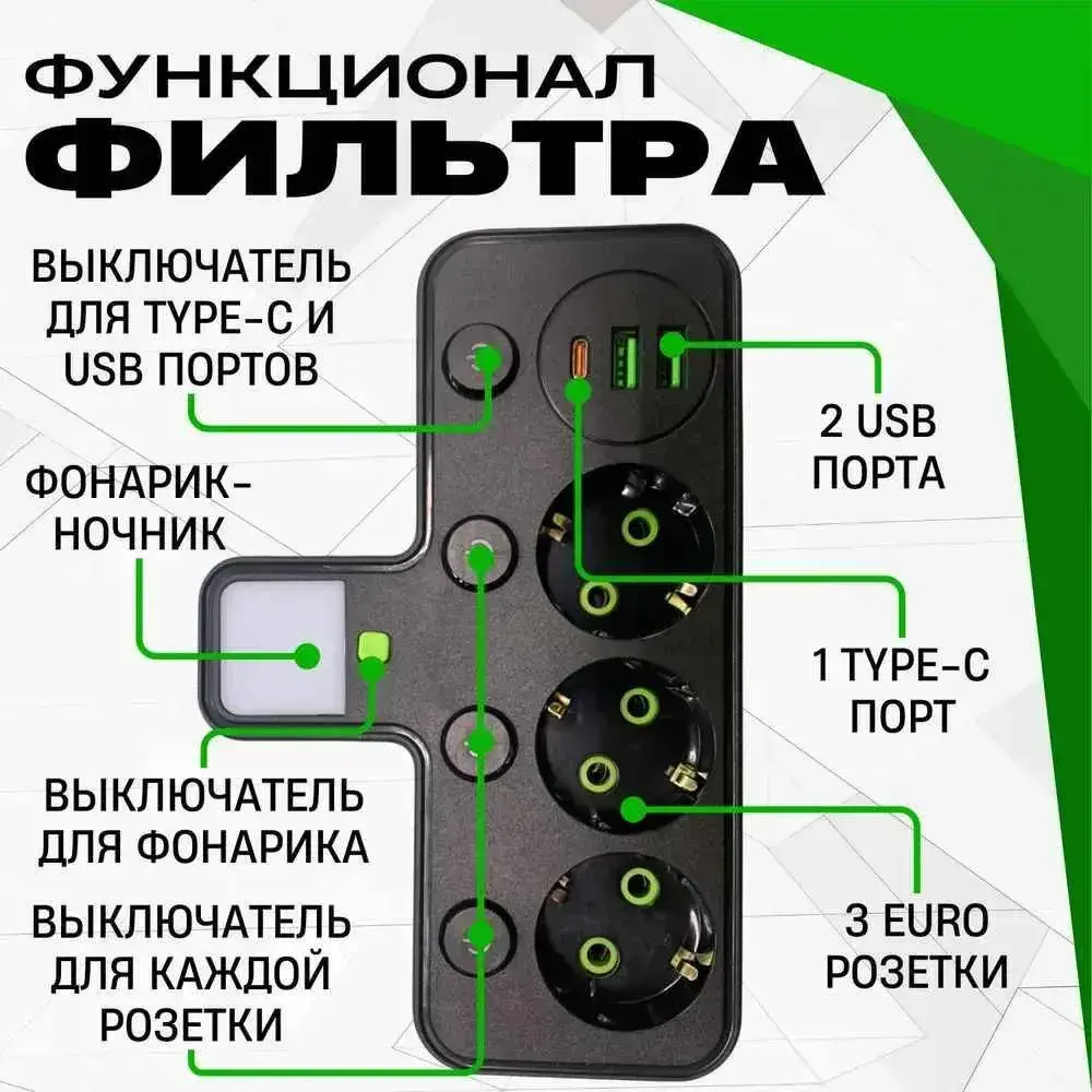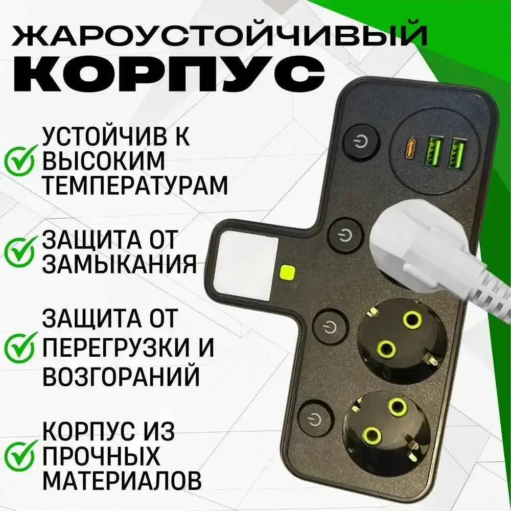 Тройник в розетку 3 гнезда с раздельными выключателями, сетевой фильтр с USB, Type-C