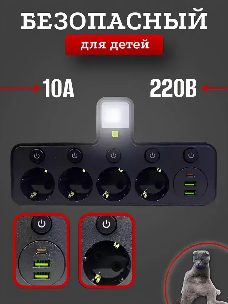 Тройник в розетку 4 гнезда с раздельными выключателями, сетевой фильтр электрический с фонариком