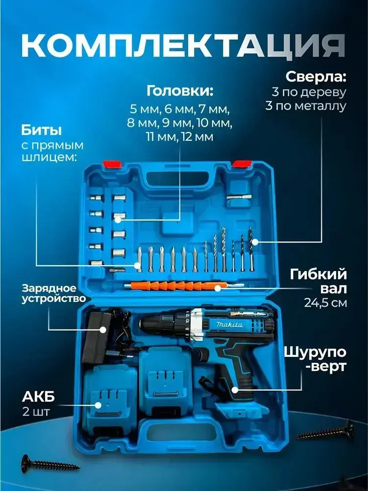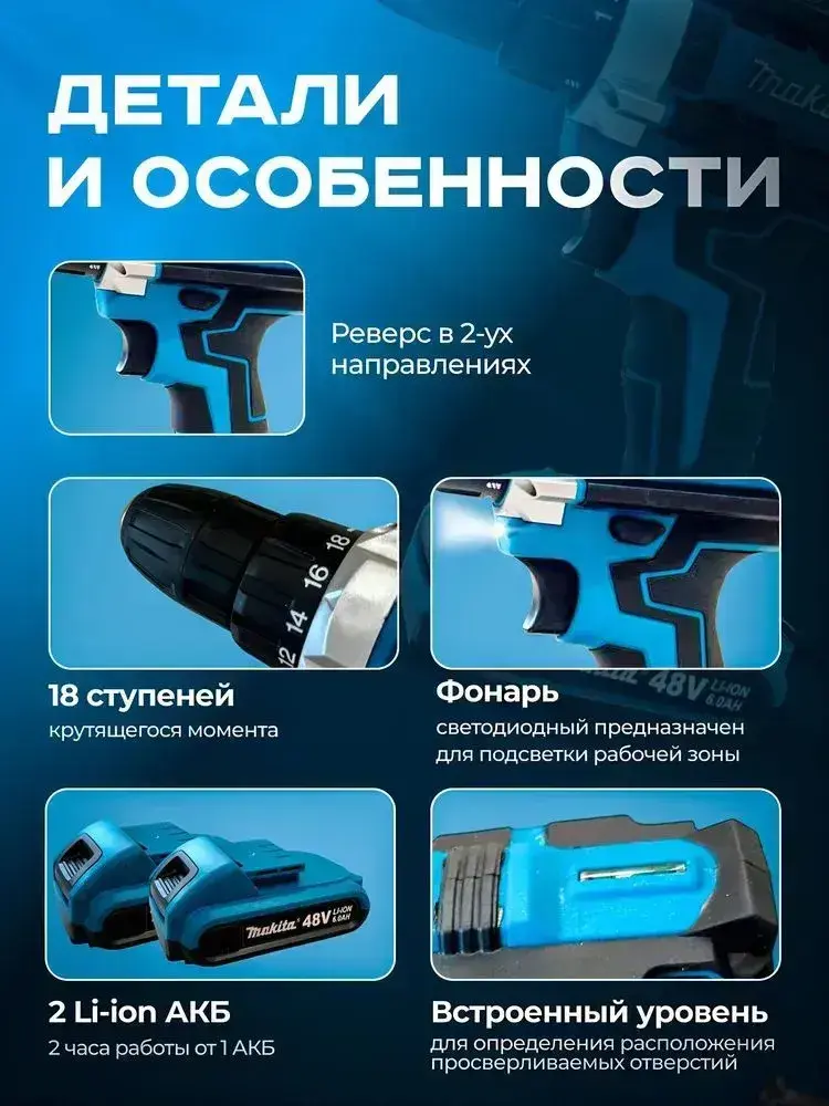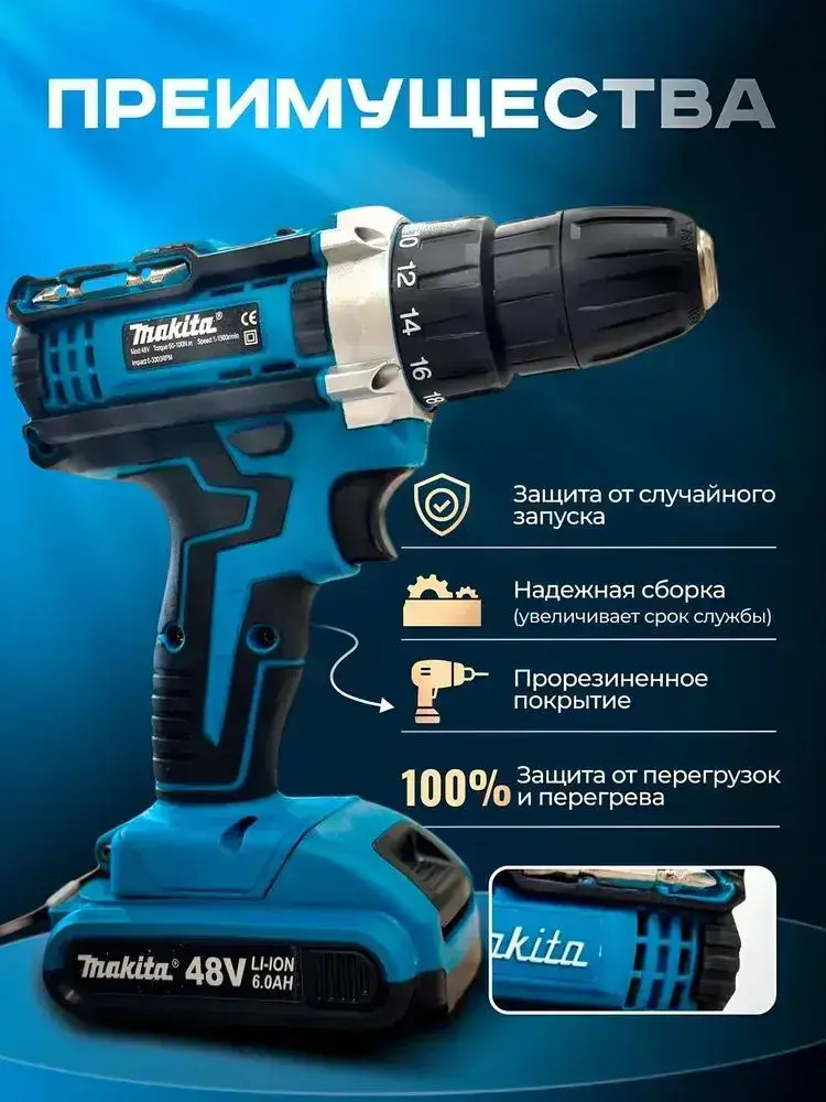 Ударная дрель-шуруповерт аккумуляторная 48В, 2 АКБ