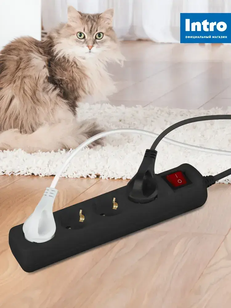 Удлинитель электрический Intro UES430-B с заземлением с выключателем 4 розетки 3 м ПВС 3x0,75мм2 10А черный