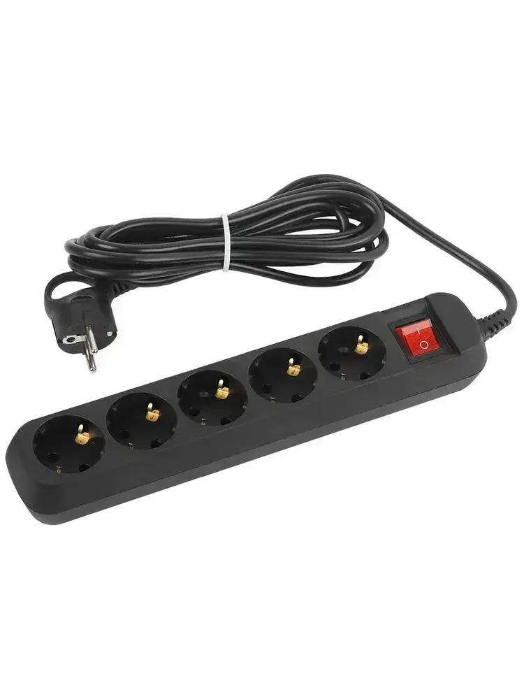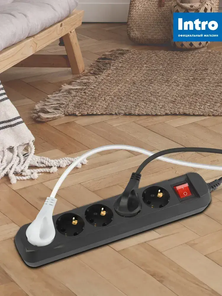 Удлинитель электрический Intro UES530-B с заземлением с выключателем 5 розеток 3 м ПВС 3х0,75мм2 10А черный