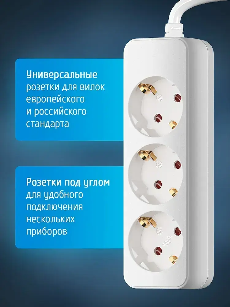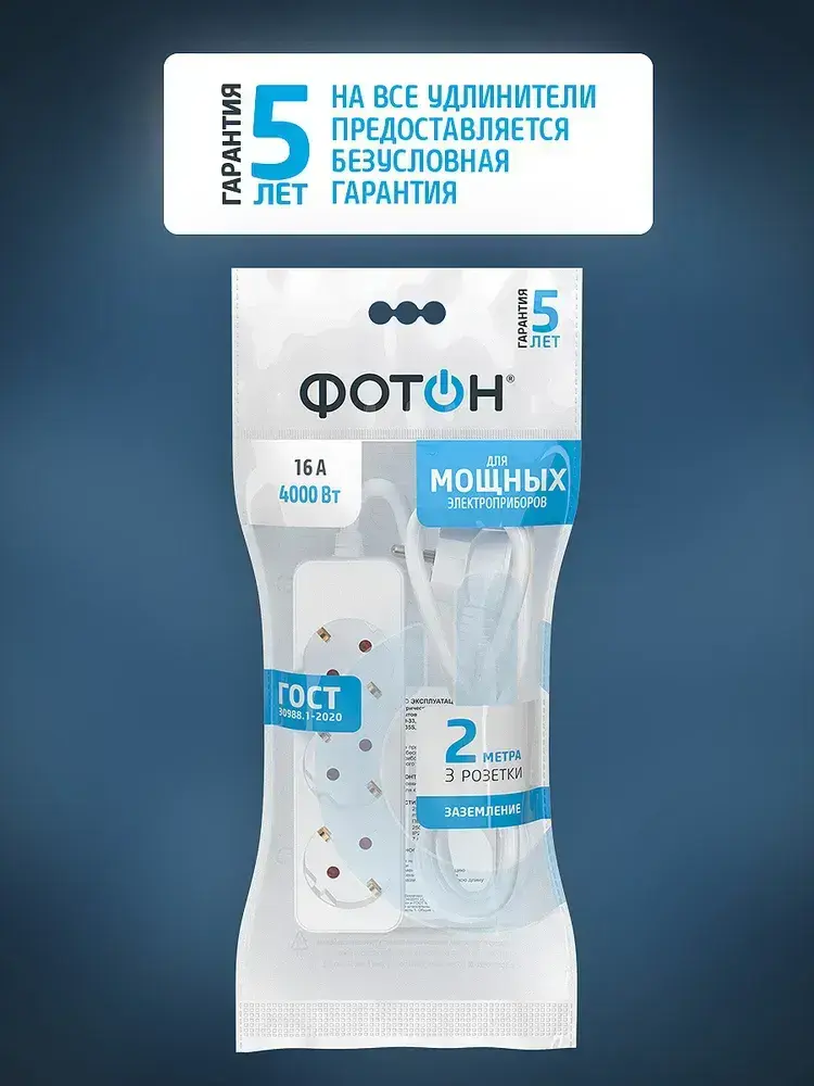Удлинитель сетевой для розетки ФОТОН 16А 2м 3 розетки с заземлением белый, ГОСТ