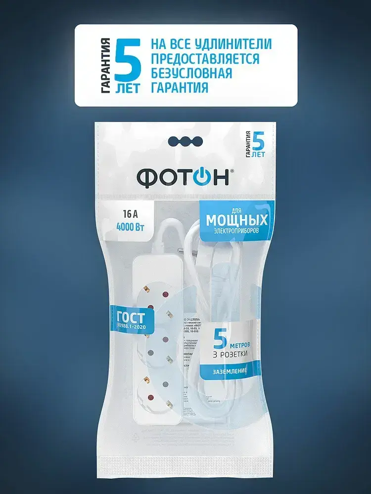 Удлинитель сетевой для розетки ФОТОН 16А 5м 3 розетки с заземлением белый, ГОСТ