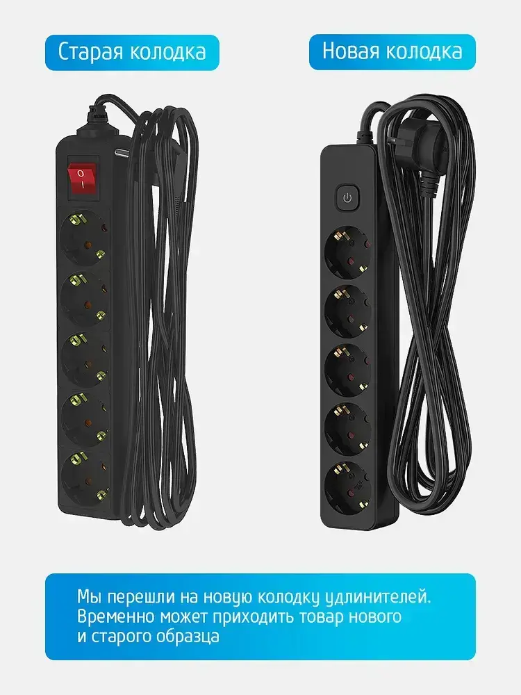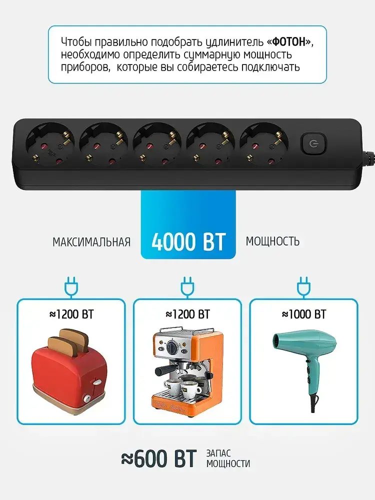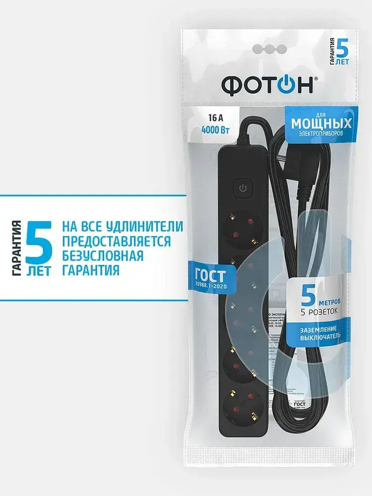 Удлинитель сетевой для розетки ФОТОН 16А 5м 5 розеток с выключателем с заземлением черный, ГОСТ