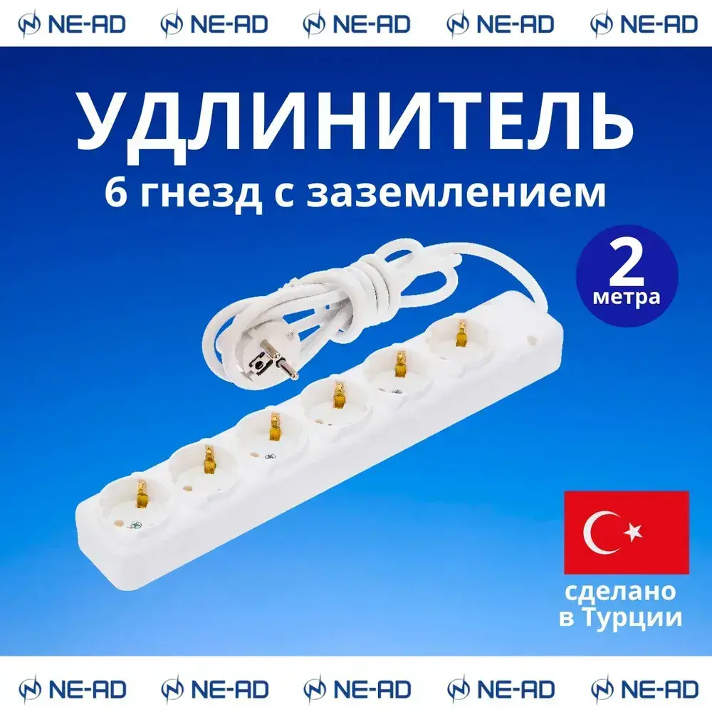 Удлинитель сетевой NE-AD с заземлением 6 гнезд, 2 метра