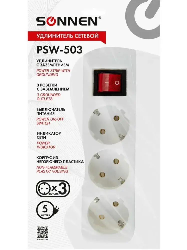 Удлинитель Sonnen Psw-503, 3 розетки c заземлением, выключатель 10 А, 5 м, белый