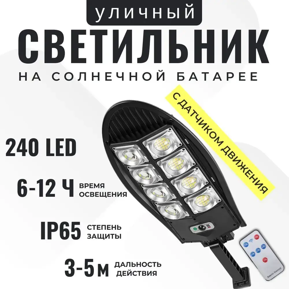 Уличный фонарь светодиодный с датчиком движении на солнечных батареях (кобра), с пультом управления