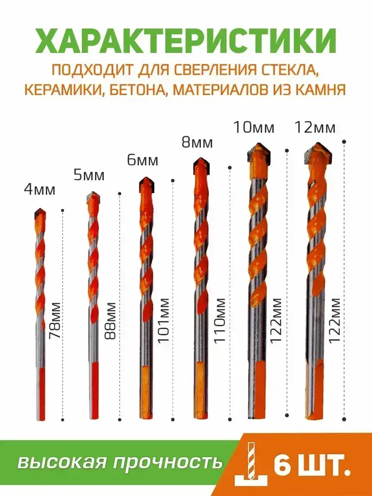 Универсальный набор сверл по бетону и керамике 6 шт.