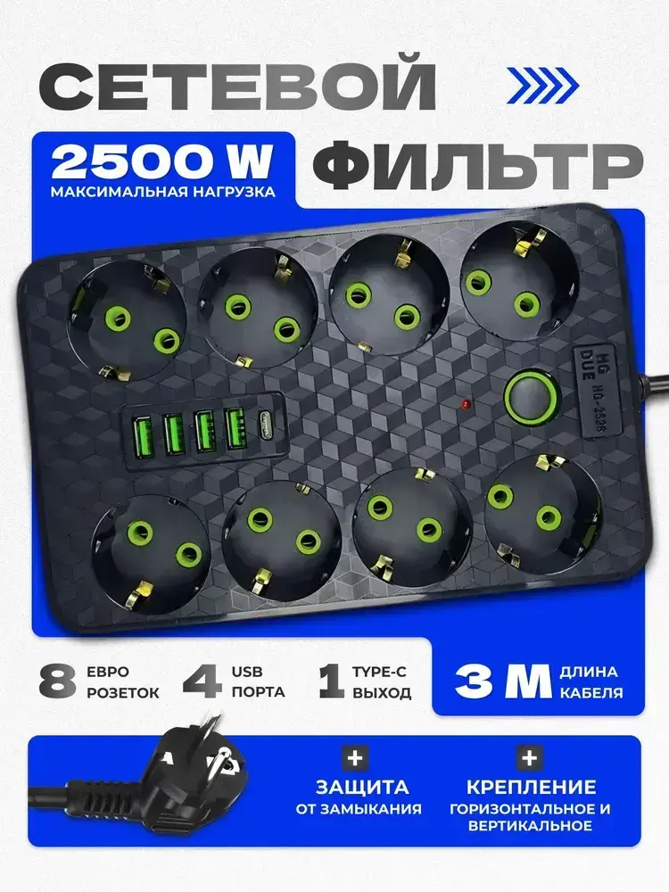 Универсальный удлинитель сетевой фильтр с предохранителем 3м, с usb, 8 розеток (переноска электрическая)