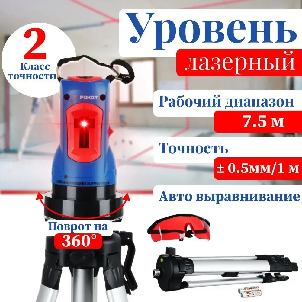 Уровень лазерный самовыравнивающийся РОКОТ, невелир строительный со штативом 2 плоскости до 7 метров, автовыравнивание