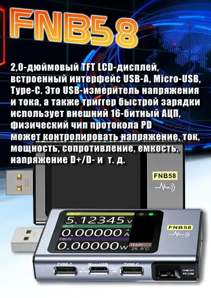 USB-тестер FNIRSI FNB58 напряжения тока и мощности / Bluetooth