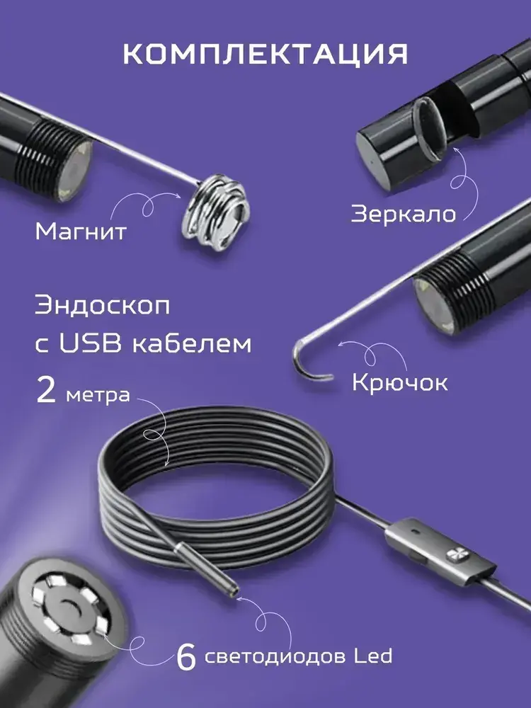 Видеоэндоскоп для смартфона / Эндоскоп ЖЕСТКИЙ шнур для смартфона и для компьютера для Android, 2 метра, microUSB, USB, Type-S водонепроницаемый