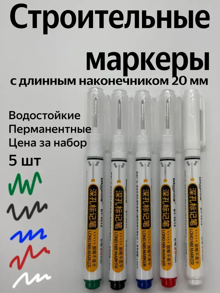 Водостойкий перманентный разметочный строительный маркер тонкий, набор 5 разноцветных с длинным наконечником, для бетона, дерева, металла и др.